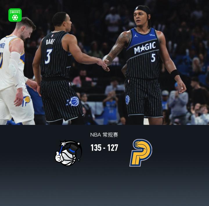 第四节魔术贝恩拿下8分,步行者西亚卡姆拿下6分,最终魔术135-127战胜步行者