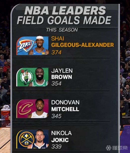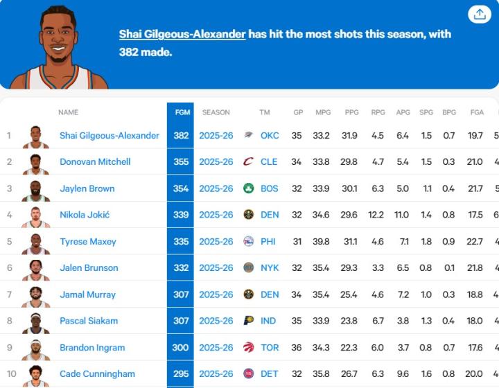 怎会全靠罚球?亚历山大本赛季运动战进球数高居联盟第一尼古拉约基奇2026-01-05 12:09北京时间今日,在NBA常规赛中,俄克拉荷马雷霆队在客场以105-108不敌菲尼克斯太阳队,遭遇本赛季的第六场失利。比赛期间,转播方晒出了一组数据,在本赛季的运动战投篮命中数方面,雷霆队当家球星亚历山大高居榜首。在今日比赛过后数据进行了更新,亚历山大以382次运动战投篮命中数位居全联盟第一,领先第二名米切尔27次;此外他本赛季共获得314次罚篮,排在阿夫迪亚之后位居第二。展开更多