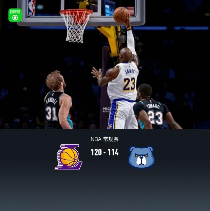第四节,开节灰熊杰克逊与湖人詹姆斯持续冲击内线回应,紧跟詹姆斯三分命中,拉拉维亚连续冲框反超比分,随后双方继续冲击内线回应之后,湖人詹姆斯2+1略微拉大分差至5分,灰熊短暂回应之后,湖人东契奇连续两记三分直接拉大至9分,灰熊威尔斯连投带罚连得11分延续悬念,湖人拉拉维亚、斯玛特、东契奇接连罚球命中收下比赛,最终湖人120-114战胜灰熊。