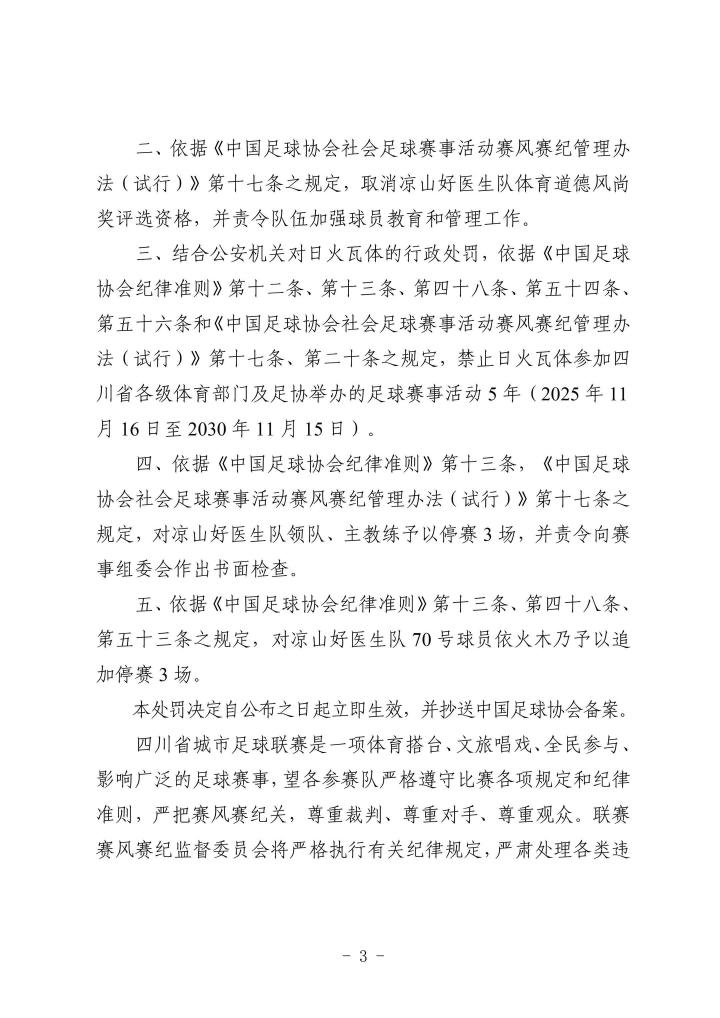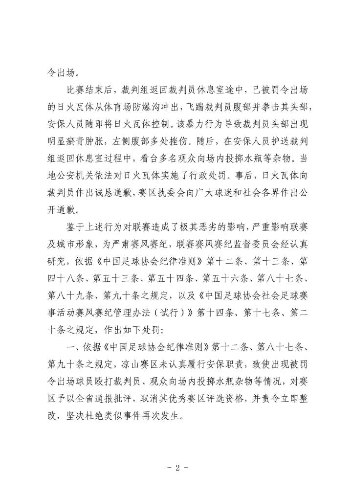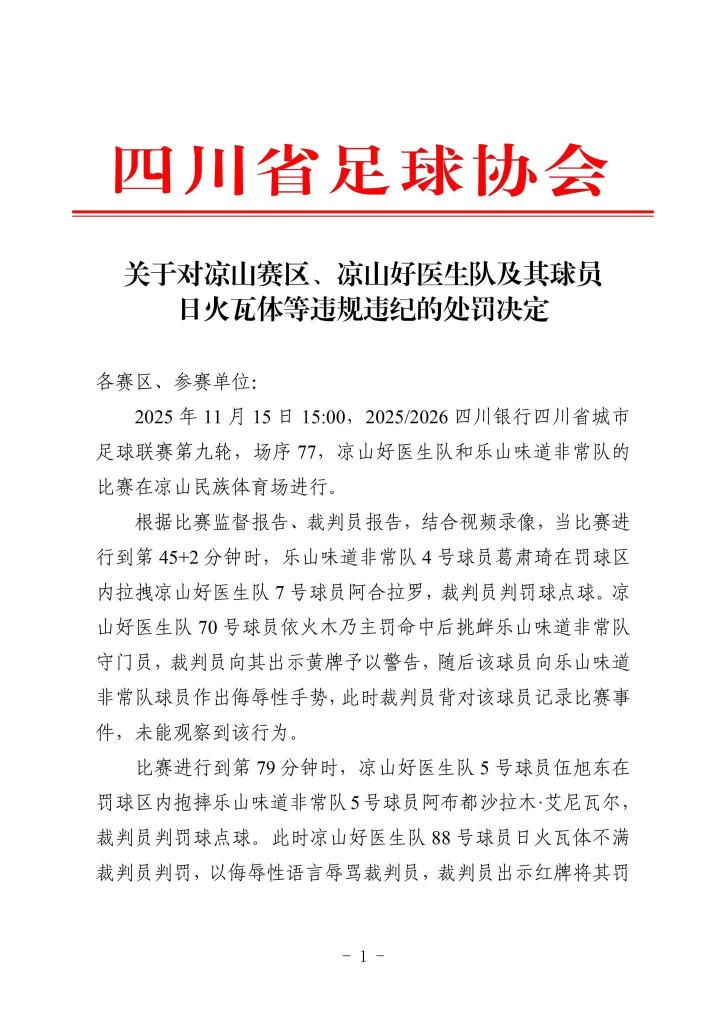 官方:凉山队日火瓦体飞踢裁判被省内禁赛5年,并被行政处罚rigeman2026-01-05 21:261月5日,四川省足球协会官方宣布,川超凉山队的球员日火瓦体因此前在比赛结束后有殴打裁判的行为,被处以5年禁赛。此外凉山赛区和凉山队其他人也有被处罚的情况。此前,日火瓦体在川超的比赛结束后,作为被红牌罚下的球员,他冲进场内,飞踢裁判员,并对裁判员进行殴打,引发了现场混乱。今天,有报道称,日火瓦体来到了天津津门虎试训,他是一名长春亚泰青训的球员,也出战了全运会。相关阅读:川超联赛出现暴力事件,凉山队球员比赛结束后飞踹裁判 记者:彝族球员日火瓦体正在津门虎试训;他曾在川超飞踹裁判具体处罚通报如下展开更多