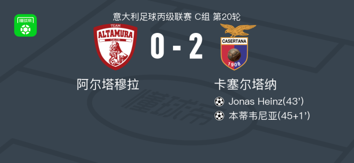 北京时间1月6日,意大利足球丙级联赛C组第20轮,阿尔塔穆拉坐镇主场迎战卡塞尔塔纳。比赛中,卡塞尔塔纳率先发动攻势,Jonas Heinz接队友配合后完成破门,为球队取得领先。上半场临近结束前,本蒂韦尼亚抓住机会再下一城,帮助球队扩大优势。此后双方均未能改写比分,最终卡塞尔塔纳以2比0客场战胜阿尔塔穆拉。
