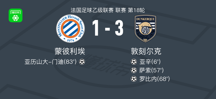 北京时间1月6日法国足球乙级联赛 联赛 第18轮,蒙彼利埃主场对阵敦刻尔克。蒙彼利埃亚历山大-门迪破门。敦刻尔克亚辛破门,萨索破门,罗比内破门。最终比分蒙彼利埃 1-3 敦刻尔克。