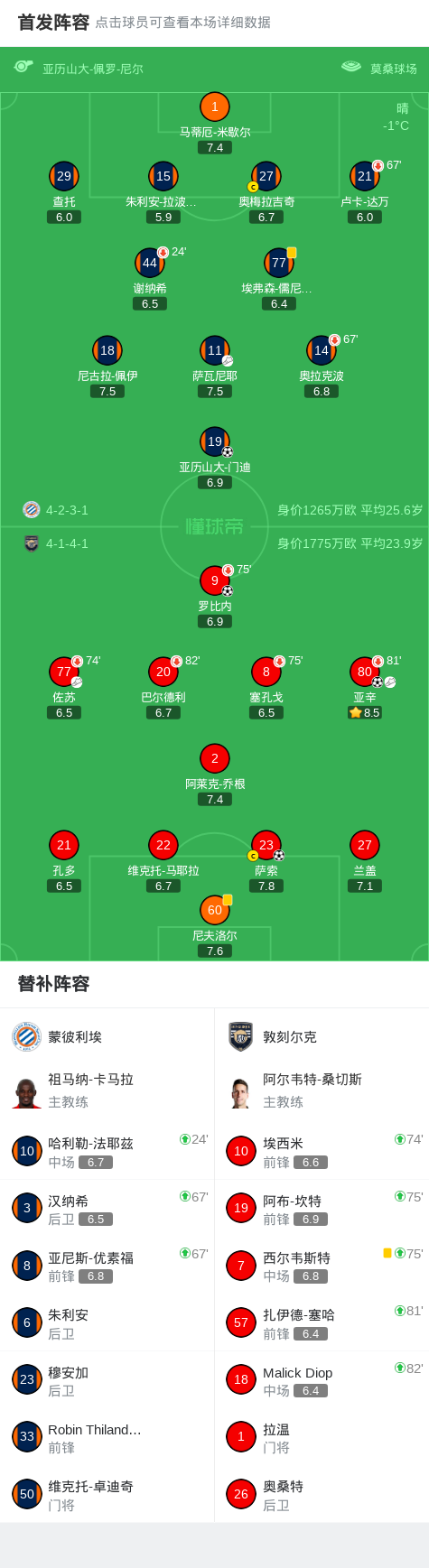 第83分钟,蒙彼利埃球员萨瓦尼耶助攻亚历山大-门迪打入一球。