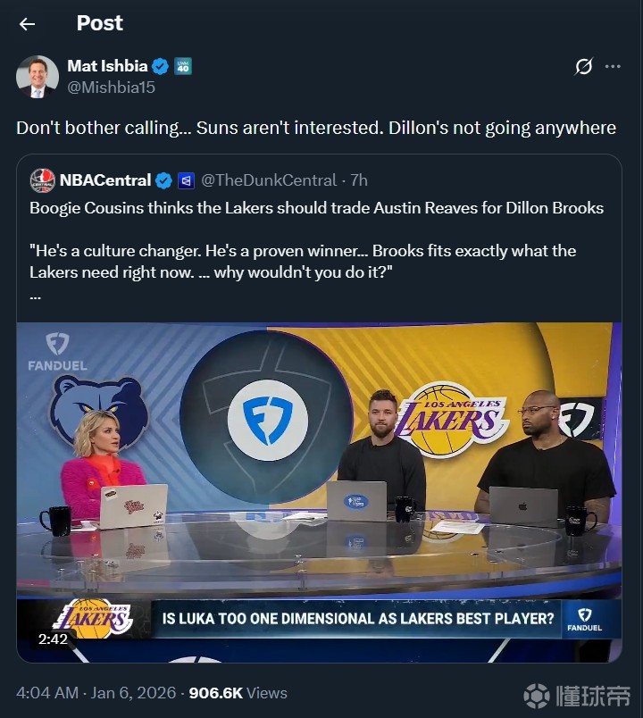 北京时间今日,在最新一期的Run It Back播客节目中,节目嘉宾、前NBA球星德马库斯-考辛斯在节目中提议,希望湖人能用里夫斯去交易太阳队前锋狄龙-布鲁克斯。