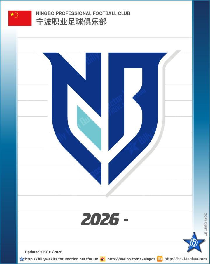 该博主写道:“上海嘉定汇龙迁往宁波后,新队徽也已面世。简洁扁平的风格替代了繁琐的虎头,由宁波首字缩写NB组成的盾牌造型与成都蓉城如出一辙,颜色也由红转蓝。新队徽好坏与否,大家来评一评。”