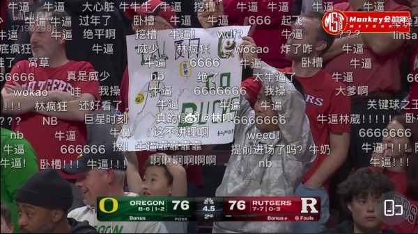 值得一提的是,常规时间最后4秒,在俄勒冈落后3分的不利形势下,林葳接球后运球至右侧45度,假投未果后直接迎着防守干拔三分,手起刀落将比赛拖入加时!本场比赛林葳的得分、三分命中数等多项数据创下NCAA生涯新高,个人的三分命中数更是与对手全队命中数持平。从上半场4投4中轰下11分刷新纪录,到末节最后3分钟独揽11分力挽狂澜,林葳的表现征服了现场球迷,转播方最后还给到了场边高举“Lin Wei厦门”标语为他欢呼的球迷。