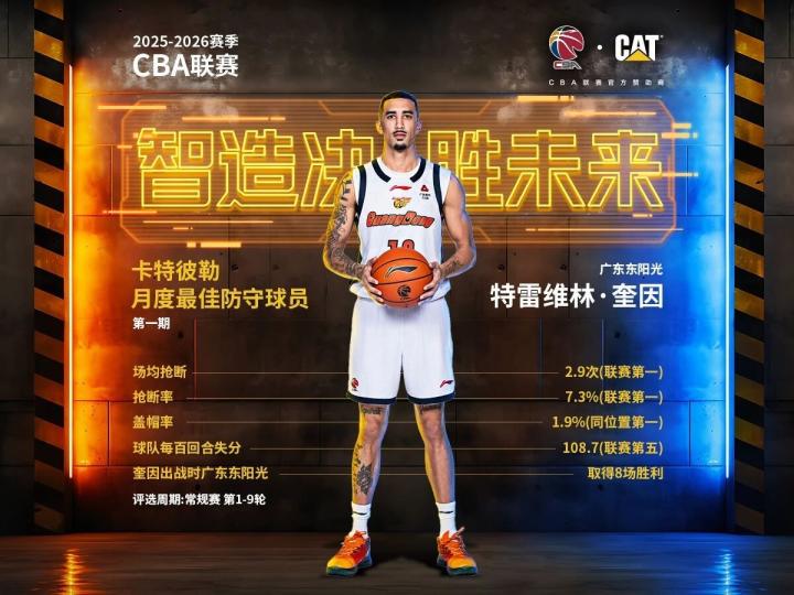 CBA官方表示:恭喜广东宏远篮球俱乐部球员特雷维林-奎因,当选2025-2026赛季CBA联赛卡特彼勒月度最佳防守球员(第1-9轮)。