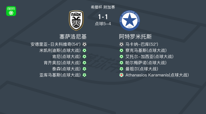北京时间1月7日希腊杯 附加赛,塞萨洛尼基对阵阿特罗米托斯。塞萨洛尼基安德里亚-日夫科维奇破门。阿特罗米托斯马卡纳-巴库破门。最终比分塞萨洛尼基 6-5 阿特罗米托斯。