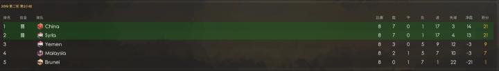 40强赛中国队被分到第二小组,同组的有叙利亚,也门,马来西亚,文莱。中国队7胜1负积21分以净胜球优势力压叙利亚小组第一出线。