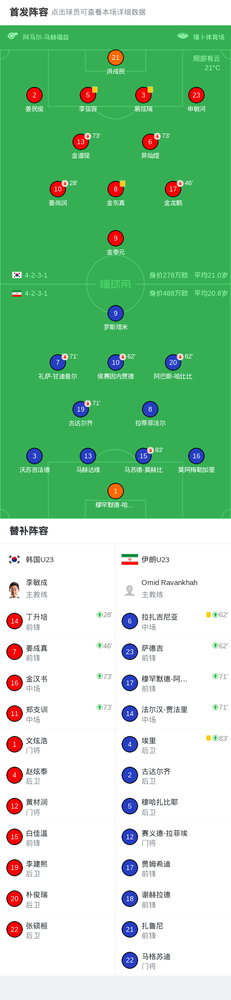 韩国U23 0-0伊朗U23,姜尚润半场伤退,韩国U23得势不得分