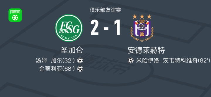 在一场俱乐部友谊赛中,圣加仑与安德莱赫特展开较量。比赛中,圣加仑率先打破僵局,汤姆-加尔接队友配合后完成破门,为球队取得领先。此后,圣加仑持续施压,金蒂利亚抓住机会再下一城,进一步扩大比分优势。安德莱赫特随后展开反击,米哈伊洛-茨韦特科维奇在进攻中把握住机会扳回一球。最终,圣加仑以2比1战胜安德莱赫特。