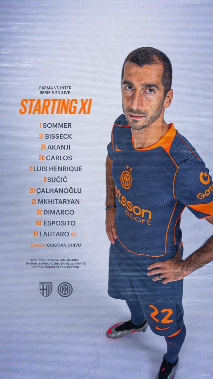 国米首发:1-索默、30-奥古斯托、31-比塞克、25-阿坎吉、32-迪马尔科、8-苏契奇、11-恩里克、20-恰尔汗奥卢、22-姆希塔良、94-埃斯波西托、10-劳塔罗