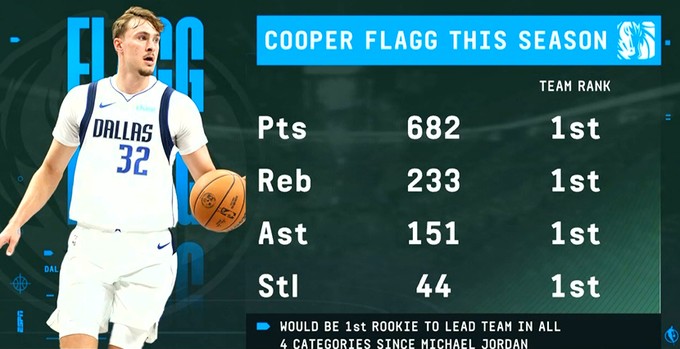 本场比赛过后,独行侠队的状元秀库珀-弗拉格在多项数据上领跑全队:包括赛季总得分(682分)、总篮板(233个)、总助攻(151个)和总抢断(44个)。