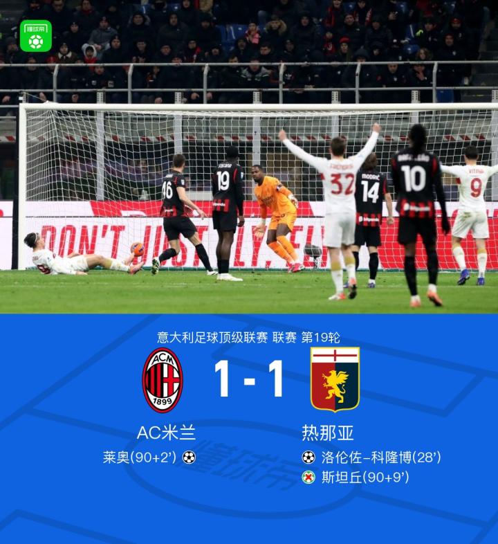 北京时间1月9日,意大利足球顶级联赛第19轮,AC米兰坐镇主场迎战热那亚。上半场,科隆博弑旧主,福法纳面对空门离奇滑倒。下半场补时阶段,莱奥头槌扳平比分。读秒阶段,热那亚获得点球,但是斯坦丘罚失。全场比赛结束,米兰1-1热那亚。