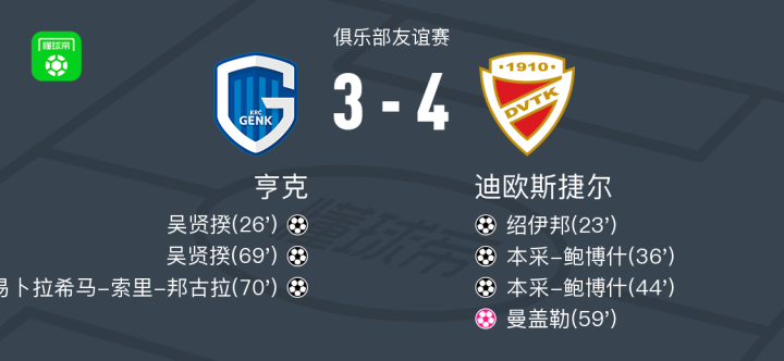 北京时间1月9日,一场俱乐部友谊赛在亨克与迪欧斯捷尔之间展开。比赛中,绍伊邦率先为迪欧斯捷尔取得进球,随后吴贤揆迅速回应,帮助亨克扳平比分。本采-鲍博什接连破门,完成两次得分,助力球队扩大领先优势。下半场,曼盖勒不慎将球打入自家球门,使对方再添一分。此后,吴贤揆再度破门,为亨克追回一球,紧接着易卜拉希马-索里-邦古拉建功,进一步缩小分差。最终,双方战成3比4,迪欧斯捷尔取得胜利。