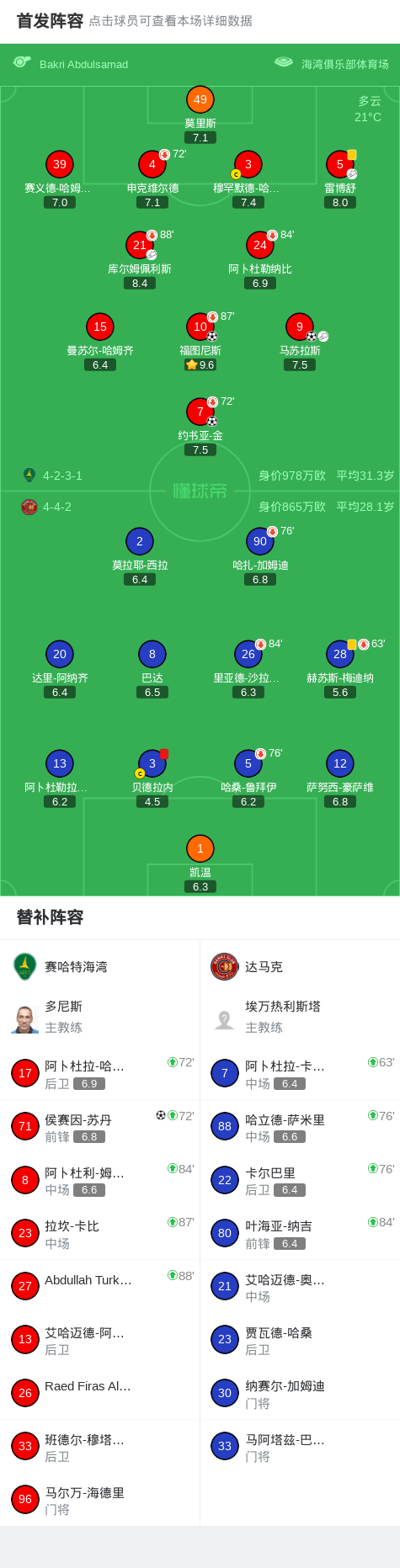赛哈特海湾4-0大胜达马克,侯赛因-苏丹、约书亚-金建功
