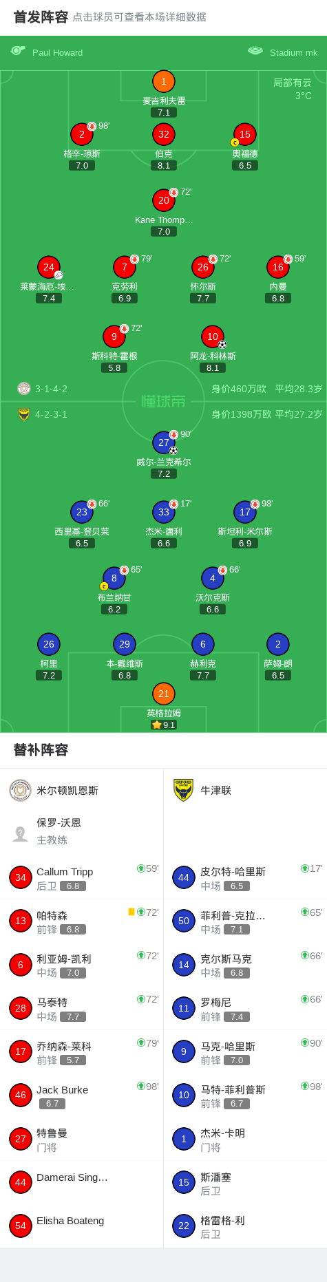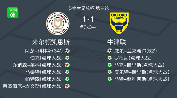 北京时间1月10日英格兰足总杯 第三轮,米尔顿凯恩斯对阵牛津联。米尔顿凯恩斯阿龙-科林斯破门。牛津联威尔-兰克希尔破门。最终比分米尔顿凯恩斯 4-5 牛津联。