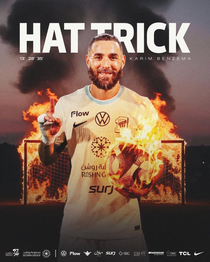 四次帽子戏法,本泽马成为吉达联合队史戴帽次数最多的球员ZeroTsu_02 @懂球帝01-10 10:32北京时间1月10日凌晨,沙特联赛第14轮,吉达联合对阵拉斯永恒,最终吉达联合4-0击败了拉斯永恒。本场比赛,本泽马首发出场80分钟,并在比赛中完成了帽子戏法。据吉达联合官方统计,本泽马成为吉达联合俱乐部在职业联赛中完成帽子戏法次数最多的球员,共达成4次。2023年夏窗加盟吉达联合以来,本泽马代表球队出场75次,贡献50球17助攻。展开更多