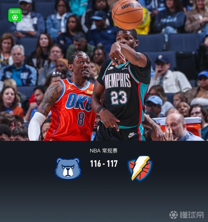 第四节灰熊考沃德拿下6分,雷霆杰伦-威廉姆斯拿下12分,最终灰熊116-117不敌雷霆