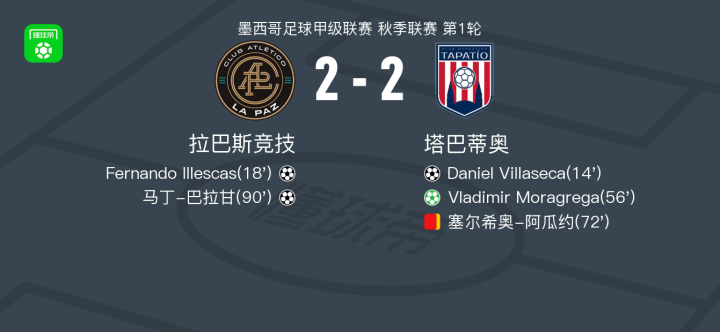 北京时间1月10日,墨西哥足球甲级联赛秋季联赛首轮展开较量,拉巴斯竞技坐镇主场迎战塔巴蒂奥。比赛伊始,塔巴蒂奥率先打破僵局,Daniel Villaseca攻入一球。随后拉巴斯竞技迅速回应,Fernando Illescas完成破门,将比分扳平。易边再战,塔巴蒂奥由Vladimir Moragrega通过点球再度取得领先。比赛进入尾声阶段,塔巴蒂奥球员累计两张黄牌被罚离场。补时前,拉巴斯竞技发动反击,伊沃-巴斯克斯送出助攻,马丁-巴拉甘把握机会建功,最终双方以2比2握手言和。