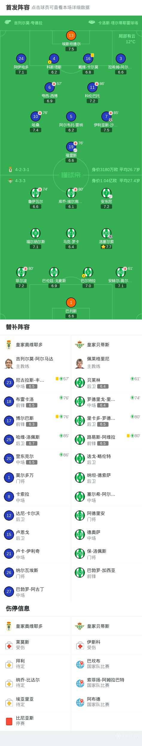 奥维耶多1-1贝蒂斯,沙伊拉贴地斩,安东尼助攻洛塞尔索扳平