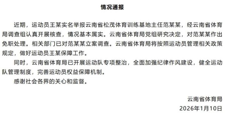 近期,运动员王某实名举报云南省松茂体育训练基地主任范某某,经云南省体育局调查组认真开展核查,情况基本属实。云南省体育局党组研究决定,对范某某作出免职处理。相关部门已对范某某立案调查。云南省体育局将按照运动员管理相关政策规定,做好运动员王某保障工作。