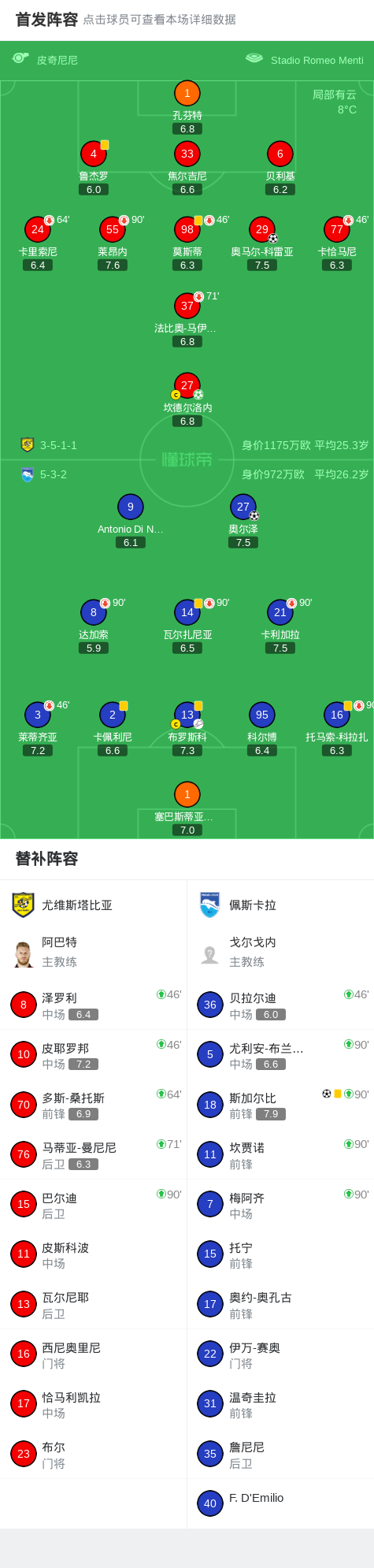 第35分钟,佩斯卡拉球员奥尔泽打入一球。