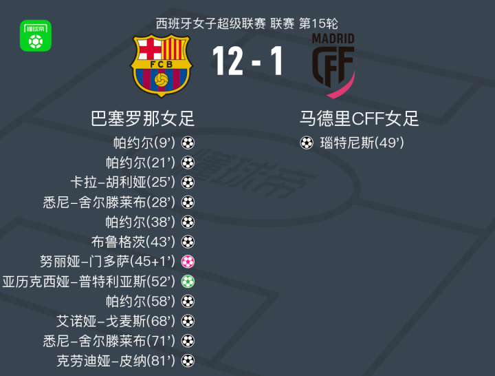 北京时间1月11日,西班牙女子足球甲级联赛第15轮展开较量,巴塞罗那女足主场迎战马德里CFF女足。比赛开局后主队迅速掌控节奏,帕约尔在队友的助攻下率先打破僵局,随后短时间内再入一球,展现出强劲的进攻火力。紧接着,卡拉-胡利娅接应攻势推射得手,将比分进一步扩大。此后悉尼-舍尔滕莱布在艾莎-卡马拉的精准传递下完成破门,球队攻势持续升级。 在上半段中段,卡拉-胡利娅再次送出关键传球,助帕约尔再度建功,完成个人本场第三粒进球。随后托雷洪为布鲁格茨创造良机,后者冷静破门。上半场补时阶段,马德里CFF球员努丽娅-门多萨不慎自摆乌龙,令客队雪上加霜。 易边再战,马德里CFF由波利亚克助攻瑙特尼斯扳回一城,短暂提振士气。但巴塞罗那女足迅速回应,亚历克西娅-普特利亚斯稳稳罚入点球,巩固领先优势。不久后她又亲自策动进攻,助攻帕约尔完成大四喜。艾诺娅-戈麦斯随后在运动战中攻入一球,进一步拉开差距。悉尼-舍尔滕莱布在马特雷特的支持下再下一城,实现梅开二度。比赛尾声阶段,马皮-莱昂助攻克劳迪娅-皮纳破门,为球队锁定最终胜局。 全场比赛结束,巴塞罗那女足以12比1战胜马德里CFF女足,取得联赛关键胜利。