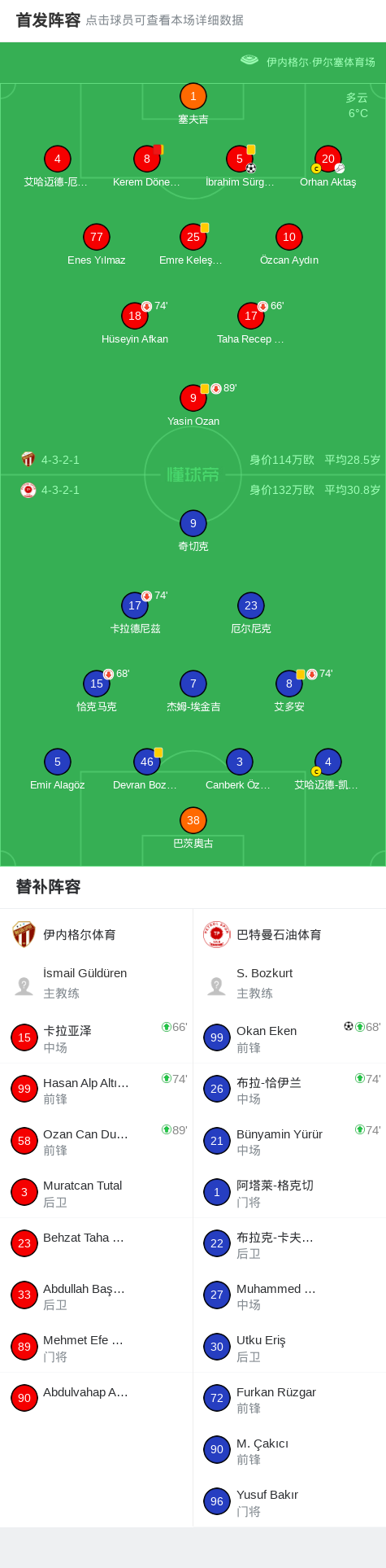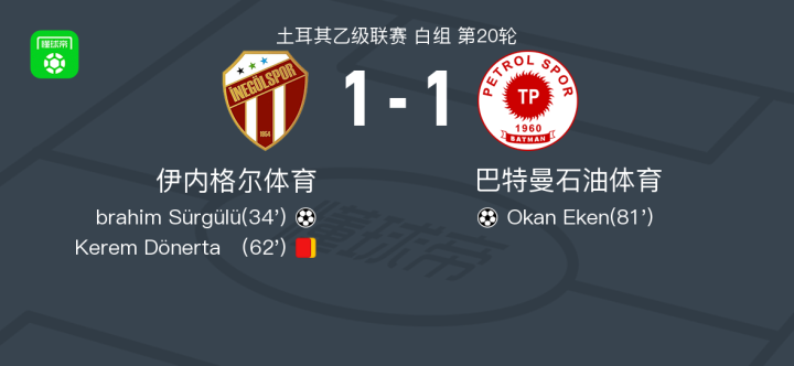 北京时间1月11日土耳其乙级联赛 白组 第20轮,伊内格尔体育主场对阵巴特曼石油体育。伊内格尔体育İbrahim Sürgülü破门。巴特曼石油体育Okan Eken破门。最终比分伊内格尔体育 1-1 巴特曼石油体育。