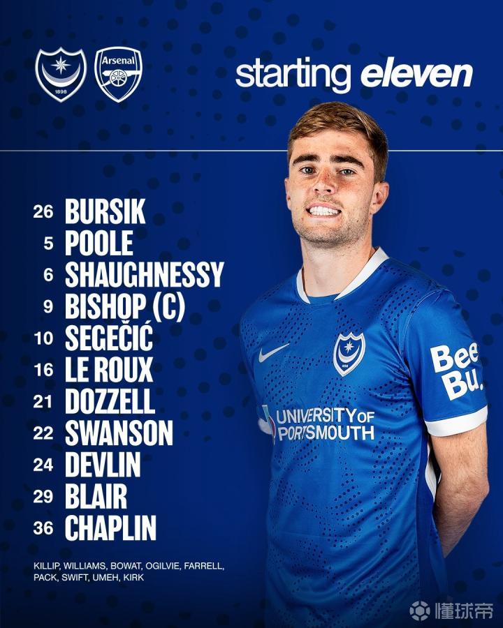 朴茨茅斯首发:26-布尔西克、24-德夫林、22-斯旺森、6-肖内西、5-普尔、16-勒鲁、21-多泽尔、29-布莱尔、10-塞格契奇、36-查普林、9-毕晓普
