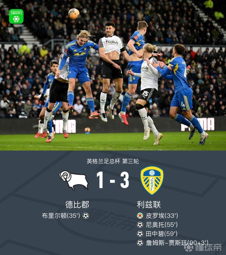 足总杯利兹联3-1逆转德比郡晋级,田中碧、尼奥托破门,皮罗埃丢点