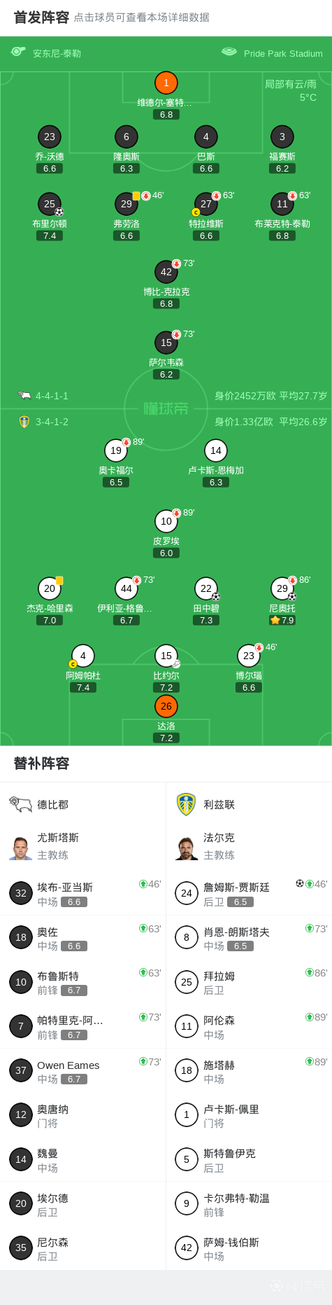 第55分钟,扳平比分,尼奥托后点劲射破门,利兹联1-1德比郡