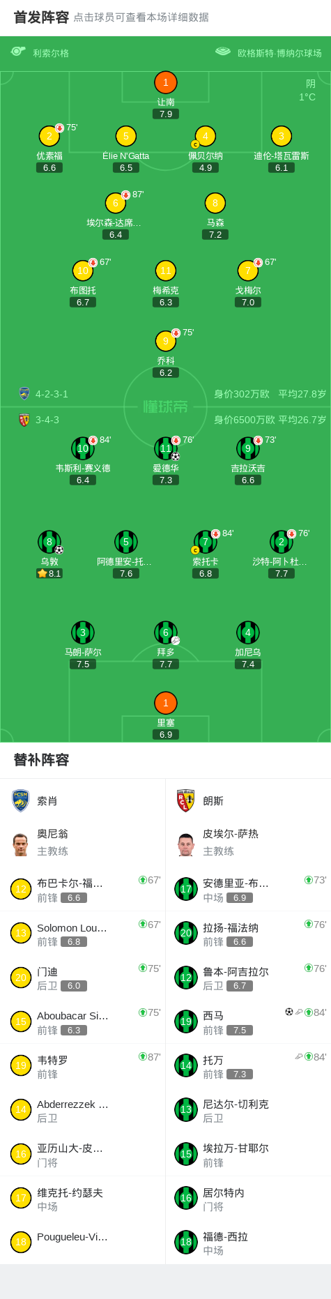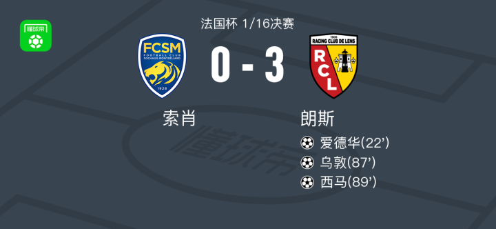 朗斯3-0大胜索肖,西马替补1传1射,乌敦破门