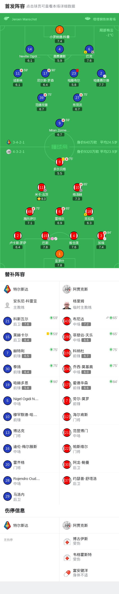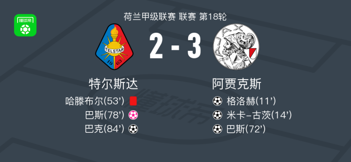 北京时间1月11日荷兰甲级联赛 联赛 第18轮,特尔斯达主场对阵阿贾克斯。特尔斯达巴克破门。阿贾克斯格洛赫破门,米卡-古茨破门,巴斯破门,巴斯自摆乌龙。最终比分特尔斯达 2-3 阿贾克斯。