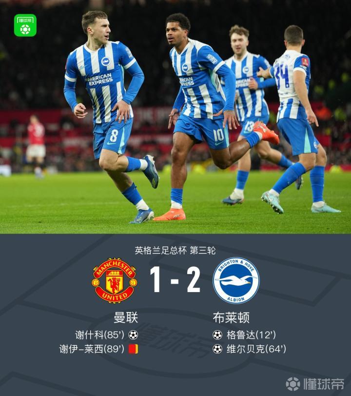 北京时间1月12日英格兰足总杯 第三轮,曼联对阵布莱顿。上半场,格鲁达门前补射建功。下半场格鲁达助攻,维尔贝克爆射破门,随后,B费角球开出,谢什科头球破门。尾声阶段,莱西不满判罚砸球发泄,裁判出示第二张黄牌将其罚下。最终比分曼联 1-2 布莱顿。