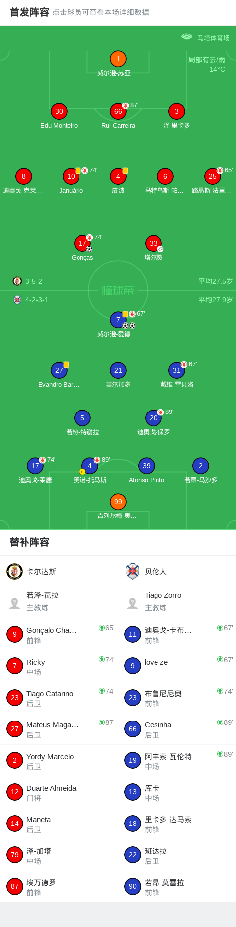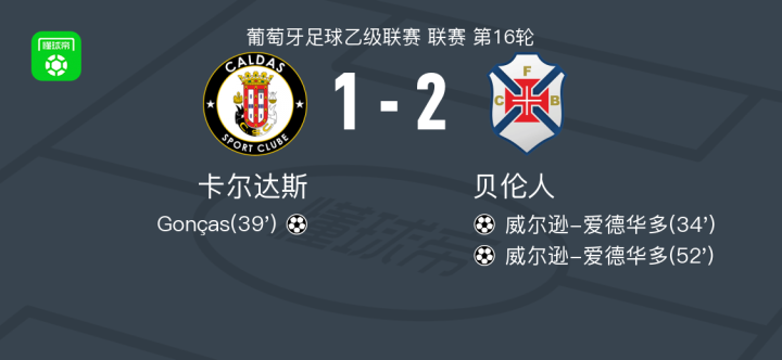 北京时间1月12日葡萄牙足球乙级联赛 联赛 第16轮,卡尔达斯主场对阵贝伦人。卡尔达斯Gonças破门。贝伦人威尔逊-爱德华多梅开二度。最终比分卡尔达斯 1-2 贝伦人。