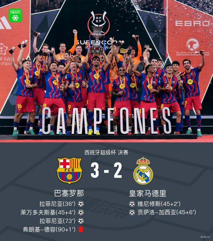 北京时间1月12日西班牙超级杯 决赛,巴塞罗那对阵皇家马德里。上半场,拉菲尼亚推射破门。维尼修斯一条龙突破扳平比分。佩德里直塞,莱万挑射得分。赫伊森头槌攻门击中门框弹出,贡萨洛补射再度扳平比分。下半场,拉菲尼亚射门折射入网,德容终场前犯规染红离场。全场比赛结束,巴萨3-2击败皇马,赢得西超杯冠军。