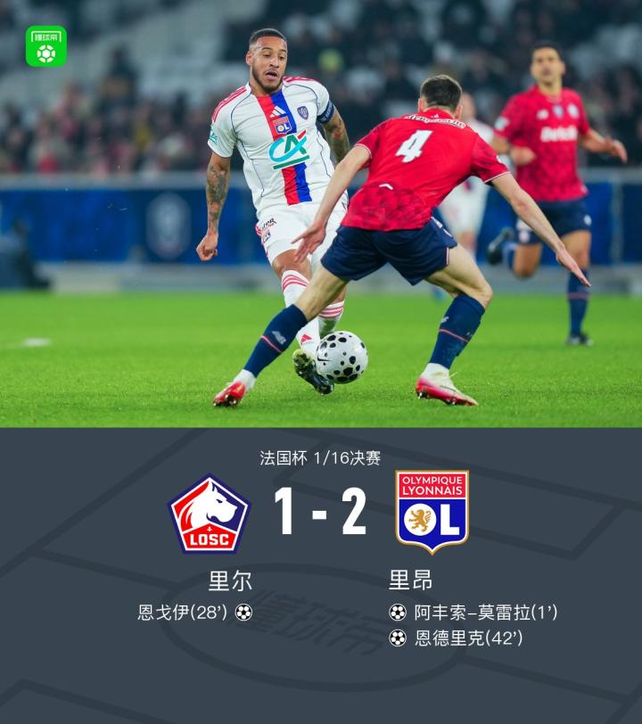 北京时间1月12日法国杯 1/16决赛,里尔对阵里昂。里尔恩戈伊破门。里昂阿丰索-莫雷拉破门,恩德里克破门。最终比分里尔 1-2 里昂。