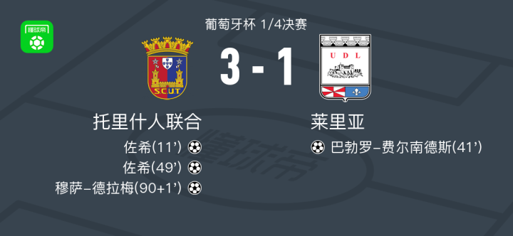 北京时间1月12日葡萄牙杯 1/4决赛,托里什人联合对阵莱里亚。托里什人联合佐希梅开二度,穆萨-德拉梅破门。莱里亚巴勃罗-费尔南德斯破门。最终比分托里什人联合 3-1 莱里亚。