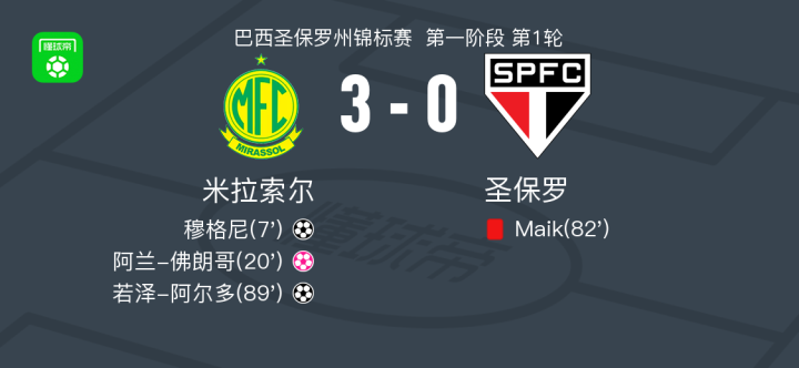 北京时间1月12日巴西圣保罗州锦标赛 第一阶段 第1轮,米拉索尔对阵圣保罗。米拉索尔穆格尼破门,若泽-阿尔多破门。圣保罗阿兰-佛朗哥自摆乌龙。最终比分米拉索尔 3-0 圣保罗。