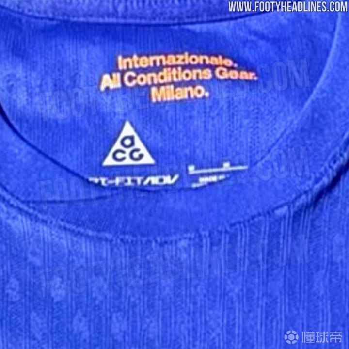 领口内侧印有橙色的“Internazionale. All Conditions Gear. Milano.”字样,以及ACG的标志。这款第四球衣的队徽也采用了特殊的边框设计,其灵感可能来源于月桂花环。