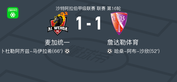 麦加统一1-1詹达勒体育,哈桑-阿布-沙欣先拔头筹,阿卜杜勒阿齐兹-马伊拉希救主
