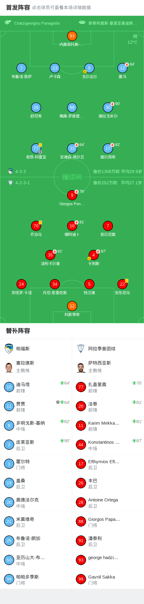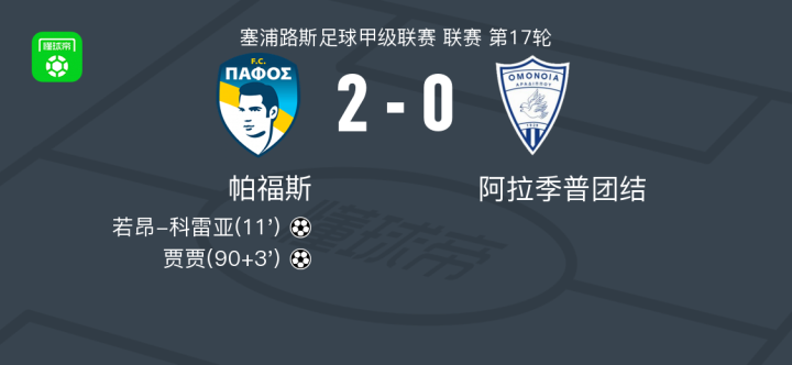 帕福斯2-0阿拉季普团结,若昂-科雷亚破门,贾贾锁定胜局