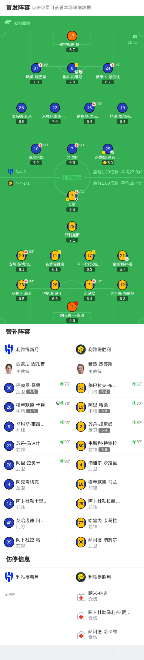 第90分钟,达瓦萨里造点,鲁本-内维斯点射命中,利雅得新月3-1锁定胜局