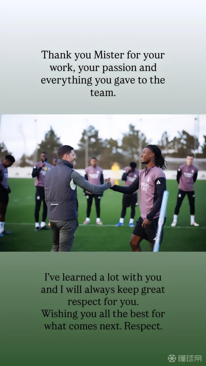 在哈维-阿隆索离任后,卡马文加在社交媒体发布了一张他和阿隆索在训练场握手的照片,并写道:“教练,感谢你所做的工作、你的热情和你给球队带来的一切。”