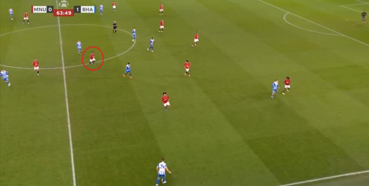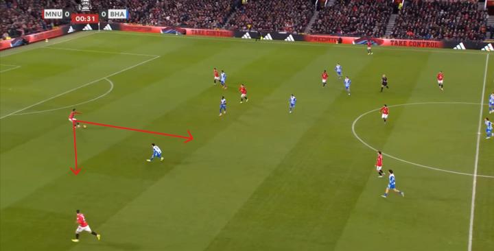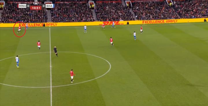 如果利桑德罗-马丁内斯此时仍在后卫线上,布莱顿当然不会在多尔古的身侧轻易得到球权,但在后卫线身前,如此大的一片空间,曼联如何覆盖?