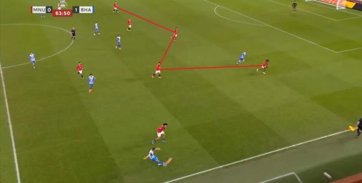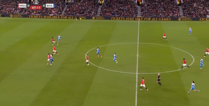 就会发现,曼联在第一线摆出了谢什科和布鲁诺,芒特则和库尼亚一起负责两翼,然后问题出在梅努和乌加特两人全部进入布莱顿的30米区域。
