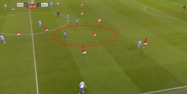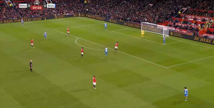于是当布莱顿选择长传找双前锋的时候,曼联后场就变成了这样: