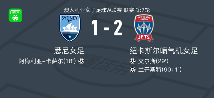 北京时间1月13日澳大利亚女子足球W联赛 联赛 第7轮,悉尼女足主场对阵纽卡斯尔喷气机女足。悉尼女足阿梅利亚-卡萨尔破门。纽卡斯尔喷气机女足艾尔斯破门,兰开斯特破门。最终比分悉尼女足 1-2 纽卡斯尔喷气机女足。