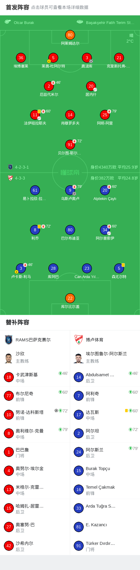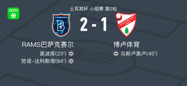 北京时间1月13日土耳其杯 小组赛 第2轮,RAMS巴萨克赛尔对阵博卢体育。RAMS巴萨克赛尔奥波库破门,努诺-达科斯塔破门。博卢体育乌斯卢奥卢破门。最终比分RAMS巴萨克赛尔 2-1 博卢体育。